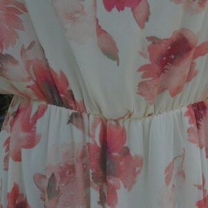 Make a statement with this classically styled chiffon dress designed by Holly Harper. Featuring a beautiful coral floral print, this dress is an eye-catcher perfect for any occasion. It boasts a fully lined, flowy design with an elastic waist for a comfortable fit and charming puff short sleeves. The square neckline adds a touch of elegance, making it a versatile addition to your wardrobe. As a sample piece, it does not have tags, so please refer to the approximate measurements for size information. This dress is new without tags.