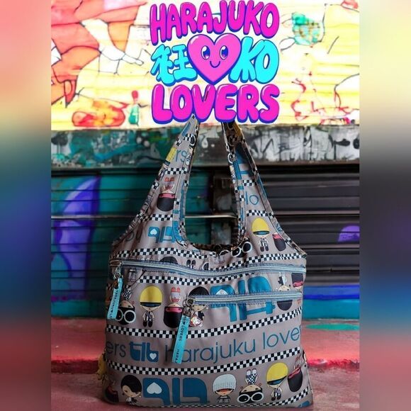 Vibrant tote with playful graphics. Features bold Harajuku Lovers design. Ideal for everyday use. By Gwen Stefani