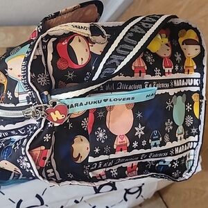 Harajuku Lovers nylon duffle in excellent condition like new hardly used measures about 10 1/2 inches in height and 17 inches in length and almost 8 inches wide on the widest side part adjustable strap