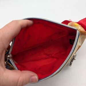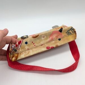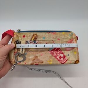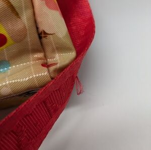 Harajuku Lovers Small Plastic Coated Canvas Mini Handbag. Pictures of carnival/movie theater/festival foods. Some red color transfer, and a snag on the strap (see photos)