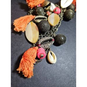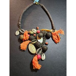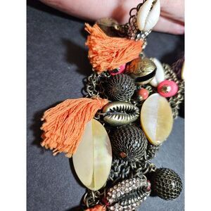 Pretty necklace has orange tassels, mother of pearl, bells,shells and more! Measures approximately 24 inches. New!