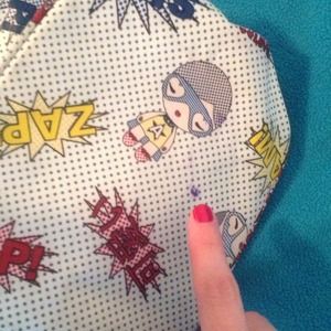 White with green details, very cute!! Has been used but has no damage really aside from a small pen stain on the bottom of the bag, which is hardly noticeable. Fairly large bag. Very cute:)