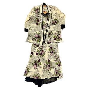 Features a beautiful floral print with shades of purple, green, and cream, accented with contrast black trim. The silk fabric drapes effortlessly and feels amazing on the skin. Perfect worn together as a statement look, or styled separately for endless outfit options.