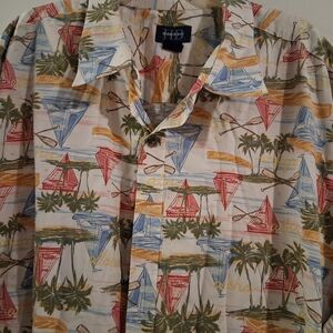 Casual button-down with vibrant island motifs. Features palm trees and sailboats. Perfect for laid-back days. Size 3x, very nice condition