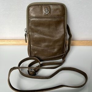 Olive green Harbour 2nd crossbody purse. In good condition but does have some distressing on leather. Zipper in good working order but the lining does fold over sometimes where you have to adjust it to close zipper.