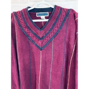 Harbour Classics Mens Vintage 80's V-Neck Cotton Cranberry and Navy Sweater. Size Large .