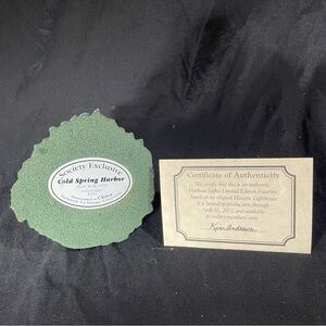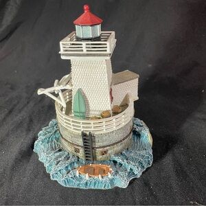 Harbour Lights, Cold Spring Harbor Charming lighthouse figurine featuring a red roof and blue waves. Perfect for nautical decor. Vintage, collectible, certificate of authenticity