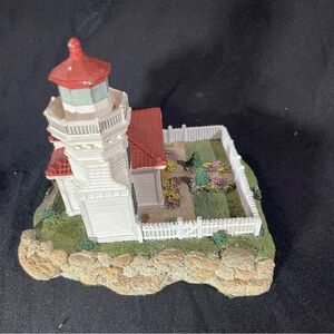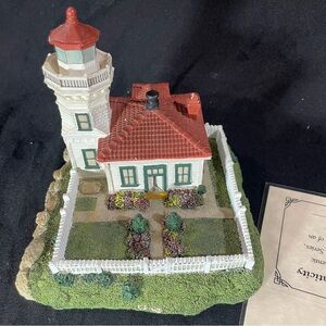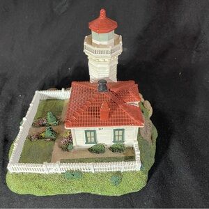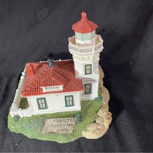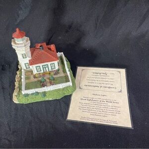 Harbour Lights, Mukilteo Charming lighthouse figurine with red roof and white structure. Features a detailed design with a small fence and greenery. Certificate of authenticity, vintage