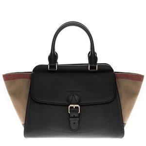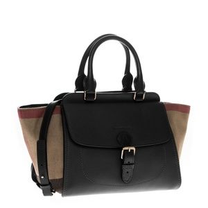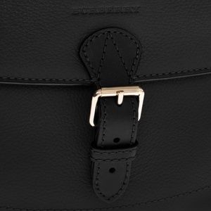 Burberry 'Medium Harcourt' Checks Patterned Side Gussets Grained Leather Satchel: Grainy leather satchel, buckle front compartment, debossed logo, & expandable sides.