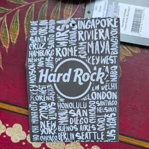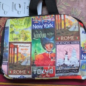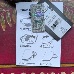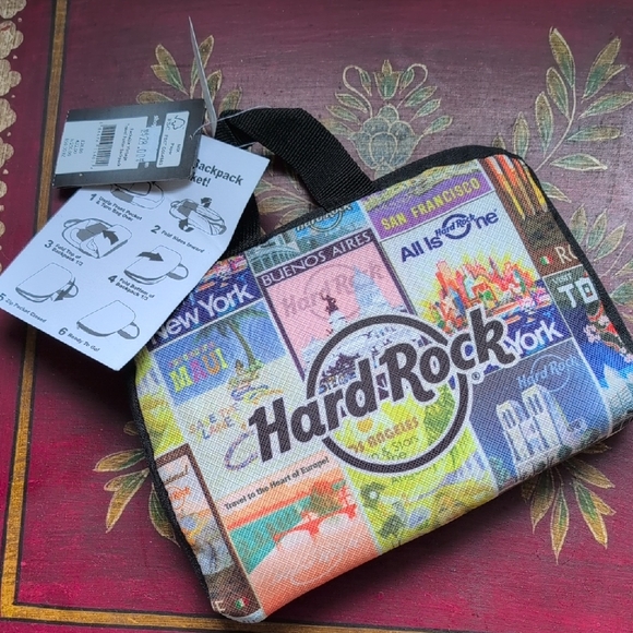 Hard Rock branded Backpack. Vibrant multicolor city-print design. Top black handle and zip. Lightweight and compact. Great for travel or daily use. Foldable full size great for any outing. New!