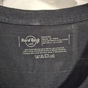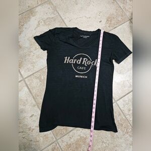 Hard Rock Cafe Munich black t-shirt featuring a sparkling rhinestone logo. This women’s medium tee has a soft, semi-sheer feel and a fitted silhouette with rolled sleeves and a scoop neckline. Perfect for collectors or fans of the iconic cafe brand.