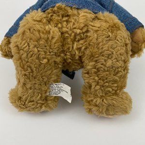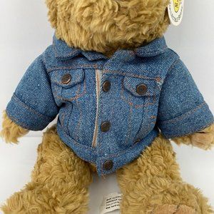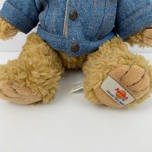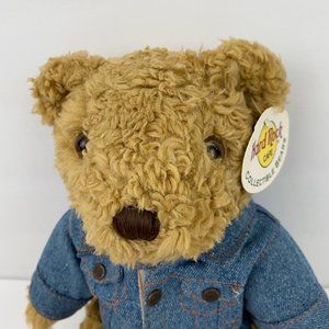 Hard Rock Cafe Orlando Collectible Bear Denim Jacket. Teddy Bear plush stuffed animal sitting wearing blue denim jacket. Jean jacket has Hard Rock Cafe Orlando and a guitar logo embroidered on the back. Still has tags attached but is Preowned and bas been displayed.