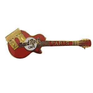 This Hard Rock Cafe Paris Arc de Triomphe Red Les Paul Guitar Pin will make a wonderful addition to your HRC pin brooch collection. It features a red Gibson Les Paul guitar, decorated with Paris' famous Arc De Triomphe. Hard Rock cafe logo and PARIS along the strings. Measures approximately 2.3 inches in length. The back has a C-clasp locking pin, which is sturdy and secure, allowing the piece to be easily attached to clothing or accessories.