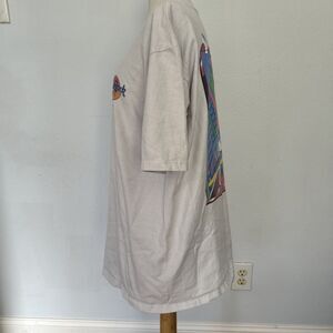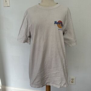 This vintage Hard Rock Cafe T-shirt is a men's size 2XL with a crew neck and short sleeves, featuring a graphic print design that gives off a 90s retro vibe. Made of cotton knit fabric in white, this pullover shirt is easy to care for and suitable for all seasons. The shirt showcases a "Save the Planet" theme, perfect for those who appreciate vintage and preppy styles from the Y2K era.
