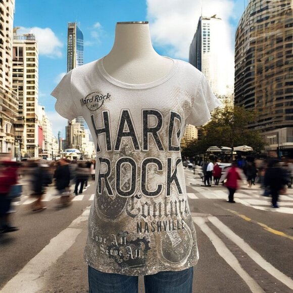 vintage tee, rocker style, Hard Rock Cafe, graphic t-shirt, rhinestone tee, distressed shirt, Nashville fashion, Y2K grunge, music lover, concert outfit, soft goth, casual streetwear, retro aesthetic, band tee vibes, edgy fashion