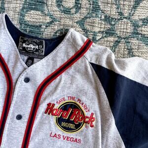 A classic vintage-style baseball jersey from the Hard Rock Hotel in Las Vegas. This short-sleeve shirt features a button-front design with red and black stripes, a gray body, and contrasting navy blue raglan sleeves. The front has "Hard Rock Hotel Las Vegas" embroidered in red and yellow with the iconic "Save the Planet" slogan. A great piece for collectors or anyone who loves retro and travel-themed apparel.