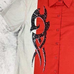 Hard Rock Park Crew Red and Grey Colorblock Button Up Short Sleeve Shirt Casual with Logo on back!