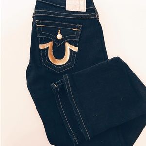 Rare! Excellent condition. Never worn. Genuine gold Swarovski crystals in place of rivets and button closures. Straight leg. Never been altered, original condition. Dark wash. Also with gold sequins (logo) on back pockets. Offers happily considered.