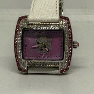 This is a hardcore brand watch. Pink mother of pearl dial, stainless steel case with white and pink crystals. White leather band. New battery just installed. Brand new never sold but original tags lost.