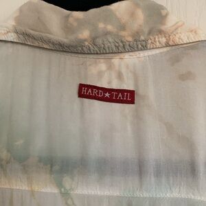 Hardtail long sleeve tie dye shirt. Perfect beach coverup! Slightly sheer. Some light pilling and small pinhole pictured. Super soft. V-neck with button. Button closure at wrist. Curved hem. Green, tan, and cream tie dye. Chest pocket and collar.