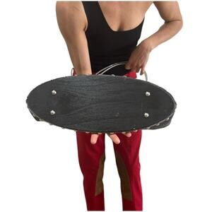 • Silver rivet accents along top and base