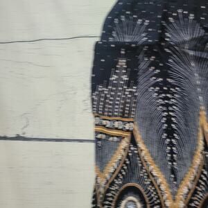 Lightweight boho harem pants featuring a vibrant peacock feather print in navy and gold tones. Breezy rayon fabric and smocked waist make them perfect for lounging, yoga, or festival wear.