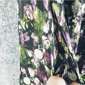 Double layer of chiffon polyester. Top layer is printed floral pattern purple white moss green. Under layer solid black.