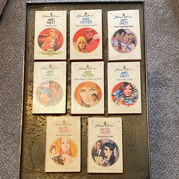 Harlequin romance novel with a classic cover. Ideal for book lovers. Seven books from the 70s and one from early 80s.