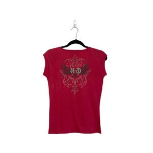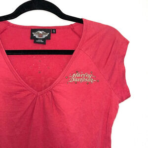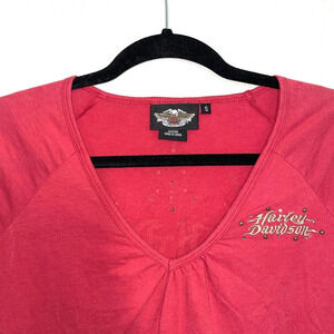 Harley Davidson red fitted graphic tee. In excellent condition! V neckline with ruching. Short sleeves. Fitted style. Harley Davidson embroidered on the front. HD & angel wings on the back with embellishments. Light red color. Size small.