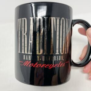 Vintage black TRADITION Harley Davidson mug with silver and red details from 2000. Iconic Harley shield logo in silver on back. Used condition with no chips or cracks, small iridescent spot near rim, please see pictures.