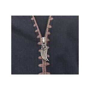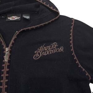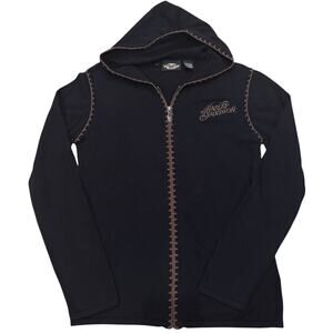 Harley Davidson Black Cotton Fine Gauge Hooded Sweater Brown Whip Stitch Detail at arm Seams and Zipper Women's Size Medium