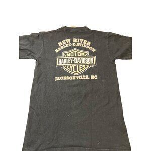 This Harley-Davidson graphic shirt, featuring Jacksonville NC Forty Five WLA design, is 100% cotton and comes in black. Sized Small.