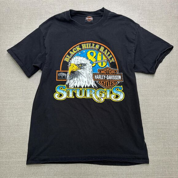 harley davidson, biker tee, sturgis anniversary, vintage graphic, black cotton, motorcycle shirt, festival apparel, distressed print, casual streetwear, motorcycle culture