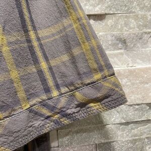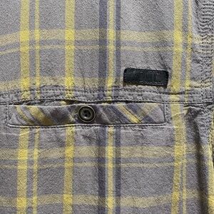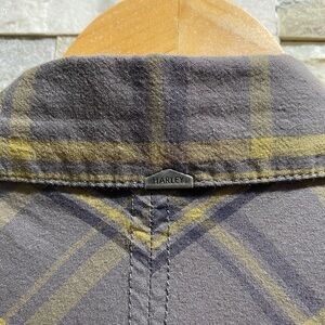 Short sleeve Harley Davidson with button down shirt, metal Harley tab on back collar, one front pocket. Plaid colors with light mustard yellow and soft brown grey.