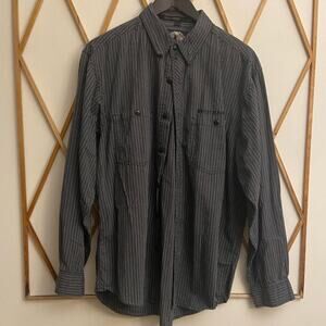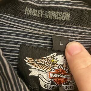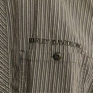 Black and gray striped Harley-Davidson button down shirt. Harley-Davidson embroidered on the chest. Size L