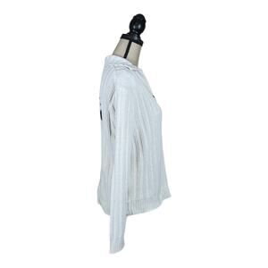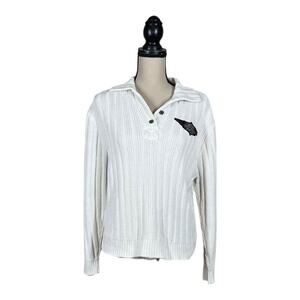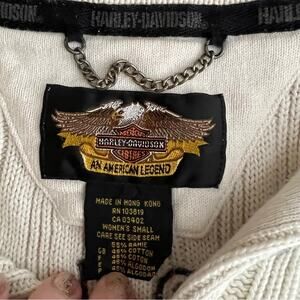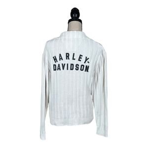 Harley Davidson Collared Appliqued Spellout Back Ribbed Sweater in a size small. Has a collar with a five button closure. Patched letters on the back. Ribbed fabric. Measures approx. 19" armpit to armpit, 23" in length. 55% Ramie, 45% Cotton. In great condition with minor ink bleeding on one sleeve, see photo.