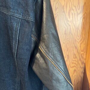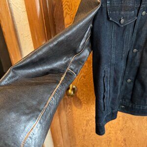 Harley Davidson Distressed Denim & Leather Jacket, size L. Body is a dark wash, heavy weight denim with black leather arms. Like new