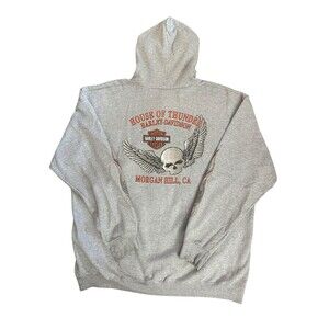 House of Thunder Harley Davidson HD Flame Sleeve Hits Double Sides Graphic Full Zip Hoodie Skull with Wings Grunge Abstract 2009 Morgan Hill CA Size XL
