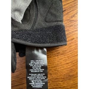 Lined glove comprised of nylon/poly blend on shell 1 and 100% poly shell 2 and lining. Cuff is poly/neoprene blend, and fill is gel. In size medium.
