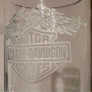 Etched Harley Davidson Motor Cycles design on one side of each glass