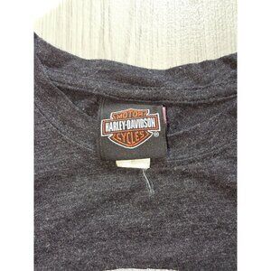 Vintage-inspired Harley Davidson t-shirt featuring an iconic eagle emblem and local dealership artwork, celebrating motorcycle culture and American heritage.