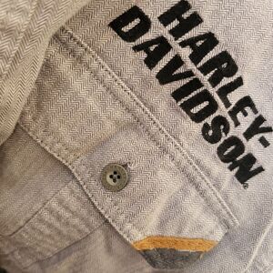 Harley Davidson men's gray herringbone button down shirt. Size XL, pit to pit measures 26", collar to hem measures 29". Genuine Harley, superior quality. Buttons also say Harley Davidson. Very small stain under right armpit, some minor wear along inside collar, see pictures. Otherwise great condition, no rips, tears, or other stains. 96438-15VM