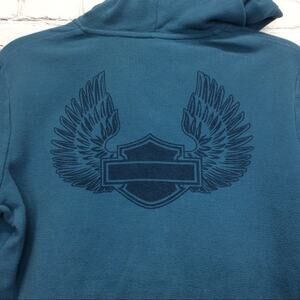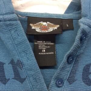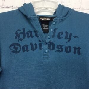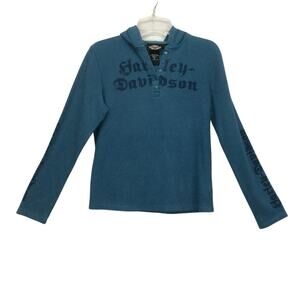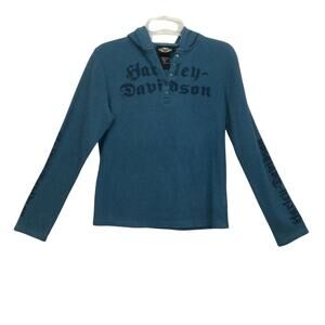 Harley Davidson Henley Shirt Women’s Size L Blue Angel Wings Waffle Knit Hooded