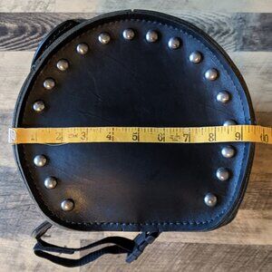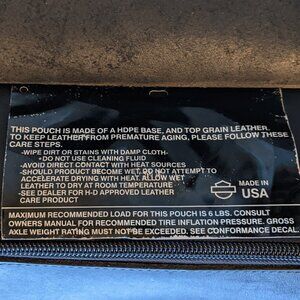 This is a Harley Davidson Touring Bag in Black. It is in excellent pre-owned condition, and has a few felt protector pads stuck onto the heavy plastic bottom mount of it (not on the leather). The dimensions are approximately 15” wide, 9” deep, 8.5” tall, and the last three images show measurements. Made to match the style of the Heritage Softail Motorcycle with the metal studs. It mounts onto the sissy bar luggage rack of practically any bike. Easy on or off with the straps and clips on the bottom. Made of thick leather with a top flap that closes with two buckles, revealing another flap that has Velcro on the end and zippers along the sides to get into the storage compartment.