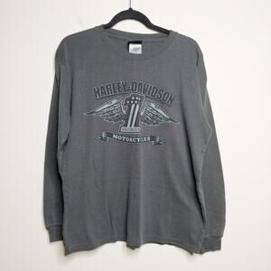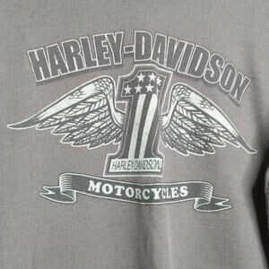 Grey thermal waffle knit tee shirt has long sleeves. Front graphic has "Harley-Davidson Motorcycles". Back has "Hot Rod Harley-Davidson Muskegon, MI" with Harley-Davidson logo. Crewneck. Pulls on over head.