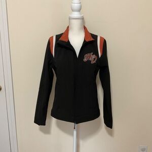 Harley Davidson Jacket Small. It features a full zip closure and soft shell fabric, making it perfect for casual occasions in summer, fall, or spring. The jacket is made of polyester and spandex, with a black and orange striped pattern and embroidered accents.