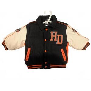 Get your little one ready for adventure with this stylish Harley Davidson varsity jacket! Featuring a classic black body with contrasting cream sleeves, this jacket combines comfort and cool. The front showcases a bold 'H D' logo, complemented by the iconic Harley Davidson patch on the sleeve. Perfect for layering, it has ribbed cuffs for a snug fit. Ideal for both playtime and casual outings, this jacket is a trendy addition to any child's wardrobe. - Vintage-inspired design - Soft and durable fabric - Bold graphics and logos - Ribbed cuffs for added comfort - Perfect for cooler weather