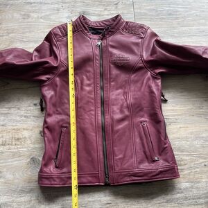 Harley-Davidson Women’s Leather Jacket in a striking red and purple Electra Mandarin design — size small. Features genuine leather construction with studded accents, embroidered detailing, and a flattering fitted cut. A bold, rare find that combines classic biker attitude with standout color and craftsmanship.
