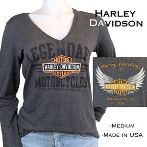 Harley Davidson women’s long sleeve V‑neck tee in charcoal gray, size medium, made in USA. Features bold “Legendary Motorcycles” front graphic with classic bar & shield, and a back dealer print for Harley‑Davidson of Washington, DC with winged logo. Soft cotton blend with thumb holes at the cuffs for extra comfort and style. Modern fit, perfect for layering with denim or under a moto jacket. Measurements are below. 2 day shipping!