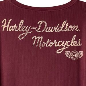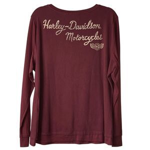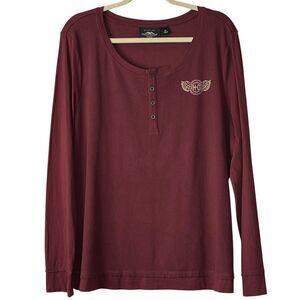 HD, logo shirt, maroon henley, biker casual top, long sleeve tee, scoop neck, metal buttons, motorcycle apparel, plus size, like new, back logo, riding